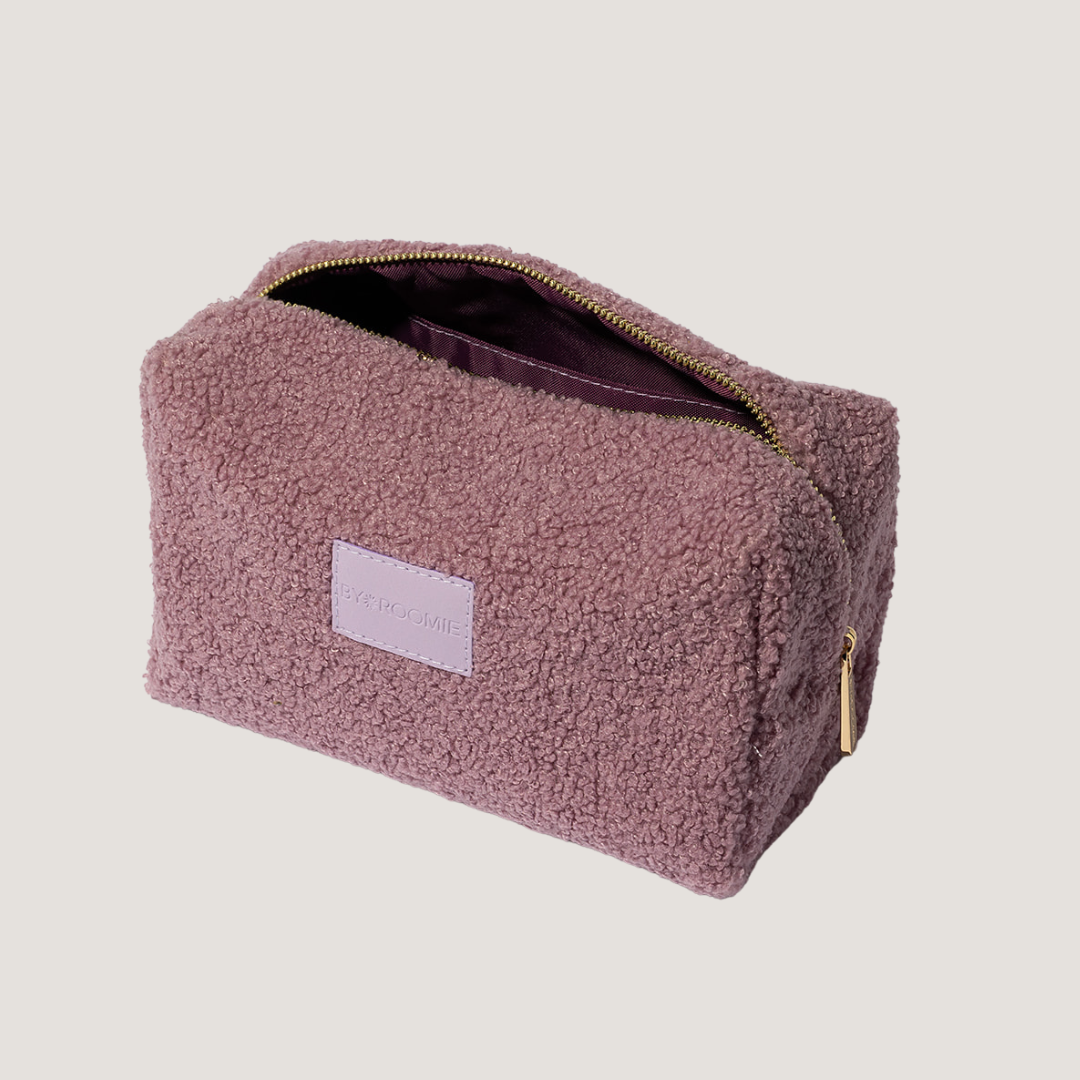 The Bobbi Makeup Bag, a luxurious and versatile machine washable cosmetic bag designed to elevate your beauty routine. Crafted from soft and plush teddy material in a stunning grape colour, this bag combines style and functionality to provide you with the ultimate storage solution for your skincare, makeup, toiletries, and hair care essentials.