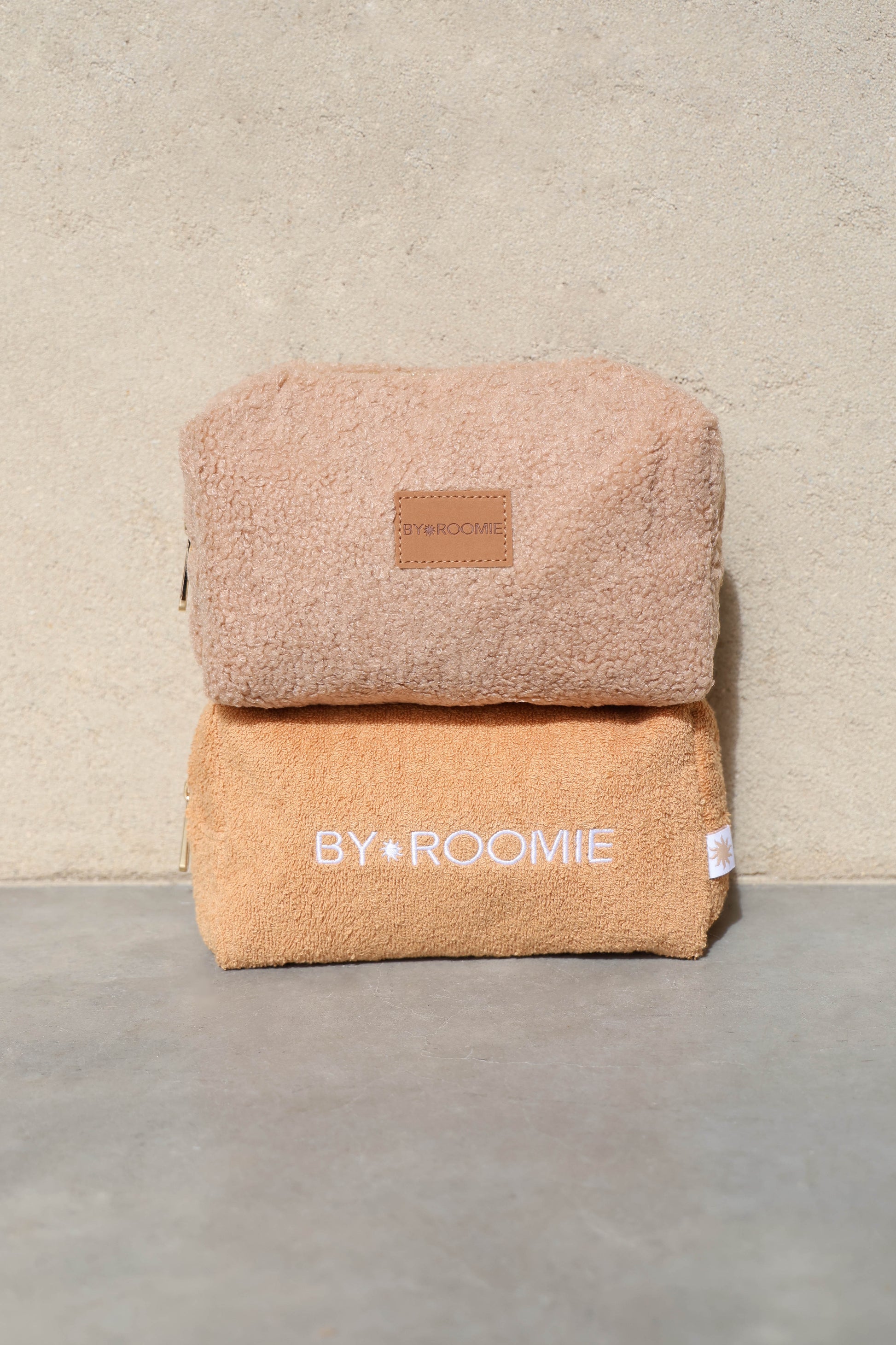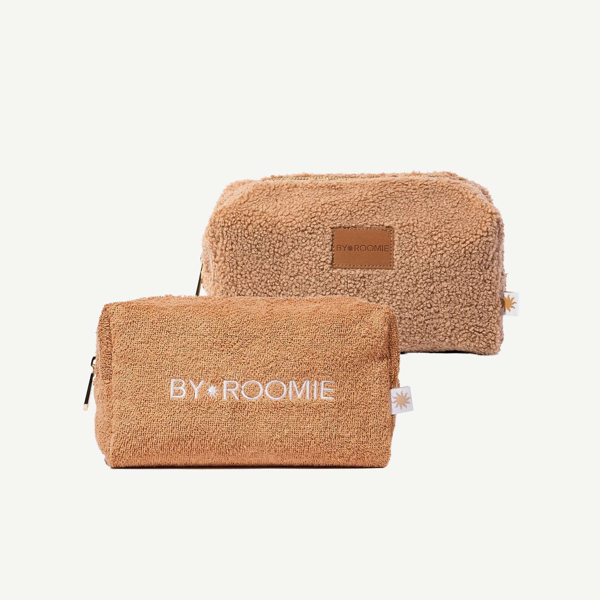 This bundle contains the terry towelling Lael Beauty bag and the teddy Bobbi Make up bag in Honey at a discounted price.